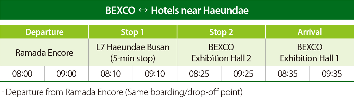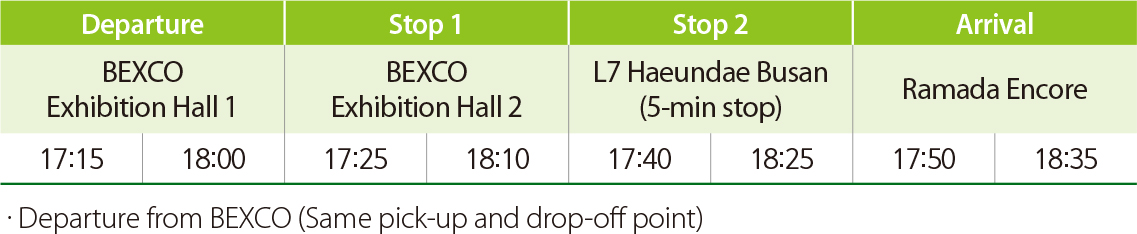BEXCO Hall 1 | BEXCO Hall 2 | L7 Haeundae Busan (5-minute stop) |